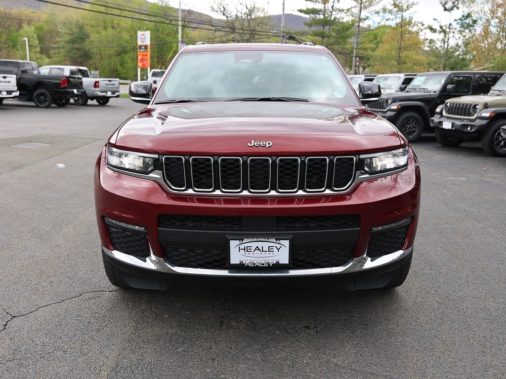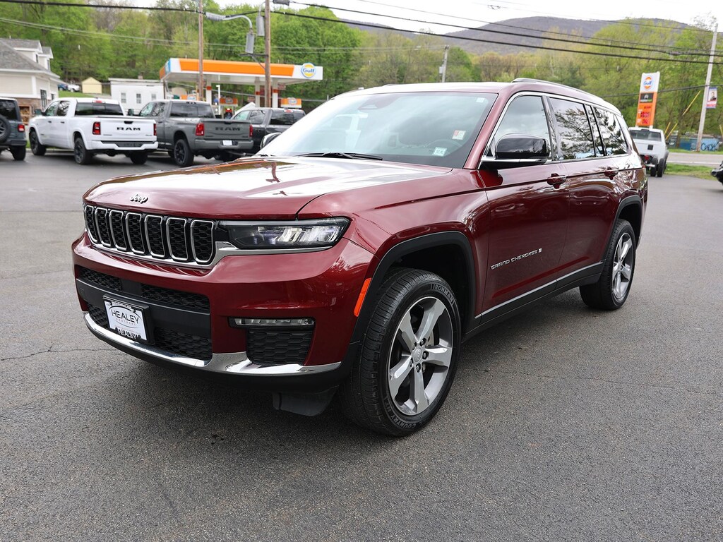 Velvet Red Pearlcoat 2021 Jeep Grand Cherokee L Limited 4WD 8-Speed Automatic 3.6L V6 24V VVT 10.1" Touchscreen Display, 3.45 Rear Axle Ratio, 3rd row seats: split-bench, 4-Wheel Disc Brakes, 506 Watt Amplifier, 6 Speakers, 9 Amplified Speakers w/Subwoofer, ABS brakes, Air Conditioning, Alloy wheels, AM/FM radio: SiriusXM w/360L, Anti-whiplash front head restraints, Apple CarPlay, Apple CarPlay/Android Auto, Audio memory, Auto High-beam Headlights, Automatic temperature control, Brake assist, Bridgestone Brand Tires, Bumpers: body-color, Capri Leather Seats, Compass, Connected Travel & Traffic Services, Connectivity - US/Canada, Delay-off headlights, Disassociated Touchscreen Display, Driver door bin, Driver vanity mirror, Dual front impact airbags, Dual front side impact airbags, Dual-Pane Panoramic Sunroof, Electronic Stability Control, Emergency communication system, Four wheel independent suspension, Front anti-roll bar, Front Bucket Seats, Front Center Armrest w/Storage, Front dual zone A/C, Front fog lights, Front reading lights, Fully automatic headlights, Garage door transmitter, Google Android Auto, GPS Antenna Input, GPS Navigation, HD Radio, Heated door mirrors, Heated front seats, Heated rear seats, Heated steering wheel, Illuminated entry, Integrated Center Stack Radio, Integrated Voice Command w/Bluetooth, Interior Rear Facing Camera, Knee airbag, Leather steering wheel, Low tire pressure warning, Manual Fold Seatbacks, Memory seat, Normal Duty Suspension, Occupant sensing airbag, Outside temperature display, Overhead airbag, Overhead console, Panic alarm, ParkView Rear Back-Up Camera, Passenger door bin, Passenger vanity mirror, Power door mirrors, Power driver seat, Power Liftgate, Power passenger seat, Power steering, Power windows, Quick Order Package 22E, Radio data system, Radio: Uconnect 5 Nav w/10.1" Display, Radio: Uconnect 5 w/8.4" Display, Rear air conditioning, Rear anti-roll bar, Rear reading lights, Rear window defroster, Rear window wiper, Reclining 3rd row seat, Remote keyless entry, Roof rack: rails only, Security system, SiriusXM Satellite Radio, SiriusXM w/360L, Speed control, Speed-Sensitive Wipers, Split folding rear seat, Spoiler, Steering wheel mounted audio controls, Tachometer, Telescoping steering wheel, Tilt steering wheel, Traction control, Trip computer, Turn signal indicator mirrors, USB Host Flip, Variably intermittent wipers, Voltmeter, Wheels: 18" x 8.0" Fully Painted Aluminum 2, Wheels: 20" x 8.5" Polished/Painted Aluminum (DISC).