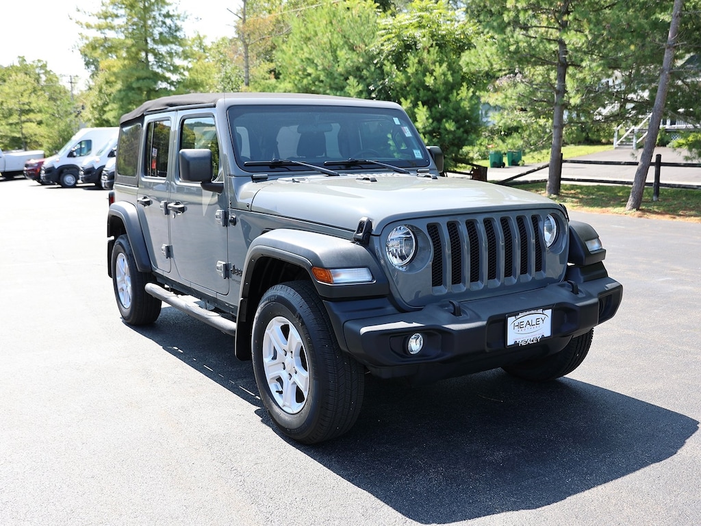 Certified. Sting-Gray Clearcoat 2022 Jeep Wrangler Unlimited Sport S 4WD 8-Speed Automatic 2.0L I4 DOHC 110 MPH Vehicle Max Speed Calibration, 2-Door Passive Entry, Front Door Locks, 220 Amp Alternator, 3.45 Rear Axle Ratio, 4-Wheel Disc Brakes, 8 Speakers, ABS brakes, Air Conditioning, Air Conditioning w/Auto Temperature Control, Air Filtering, Alpine Premium Audio System, AM/FM radio, Apple CarPlay/Android Auto, Automatic Headlamps, Aux Battery, Brake assist, Cloth Low-Back Bucket Seats, Cluster 7.0 TFT Color Display, Cold Weather Group, Compass, Convenience Group, Corning Gorilla Glass, Deep Tint Sunscreen Windows, Delay-off headlights, Driver door bin, Driver vanity mirror, Dual front impact airbags, Dual front side impact airbags, Electronic Stability Control, Emergency communication system: SiriusXM Guardian, Engine Oil Cooler, Front 1-Touch Down Power Windows, Front anti-roll bar, Front Bucket Seats, Front Center Armrest w/Storage, Front fog lights, Front reading lights, Heated Front Seats, Heated Steering Wheel, Integrated roll-over protection, Leather Wrapped Steering Wheel, Low tire pressure warning, Non-Lock Fuel Cap w/o Discriminator, Normal Duty Suspension, Occupant sensing airbag, Outside temperature display, ParkView Rear Back-Up Camera, Passenger door bin, Passenger vanity mirror, Power Heated Mirrors, Power steering, Premium Black Sunrider Soft Top, Quick Order Package 22S Sport S, Radio data system, Radio: Uconnect 4 w/7 Display, Rear anti-roll bar, Rear reading lights, Remote Keyless Entry, Security Alarm, SiriusXM Radio Service, SiriusXM Satellite Radio, Speed control, Speed Sensitive Power Locks, Split folding rear seat, Sport S, Steering wheel mounted audio controls, Stop-Start Dual Battery System, Sun Visors w/Illuminated Vanity Mirrors, Tachometer, Technology Group, Telescoping steering wheel, Tilt steering wheel, Traction control, Trip computer, Universal Garage Door Opener, Variably intermittent wipers, Wheels: 17 x 7.5 Black Steel Styled, Wheels: 17 x 7.5 Tech Silver Aluminum.