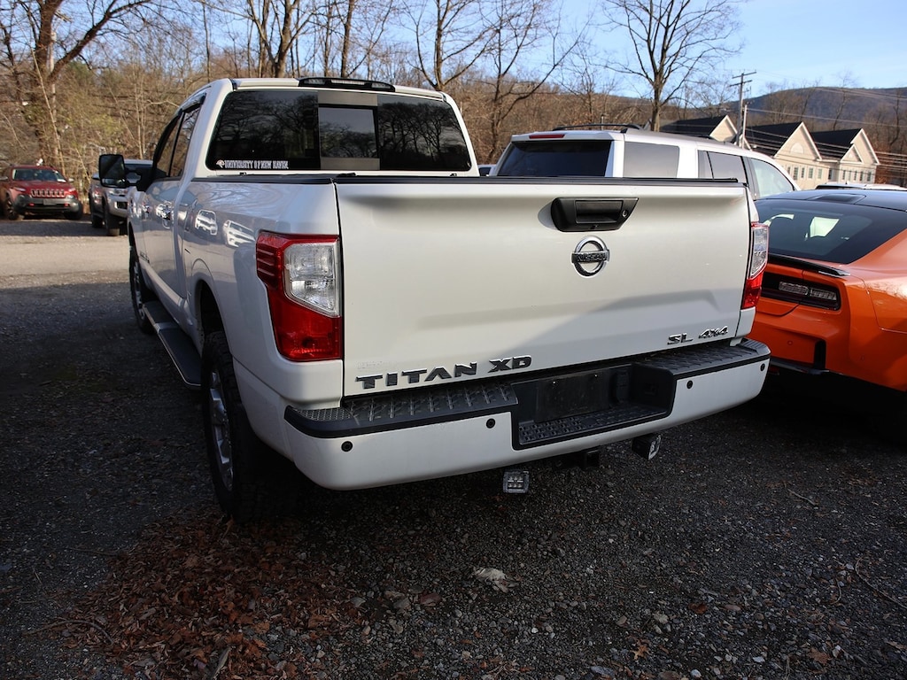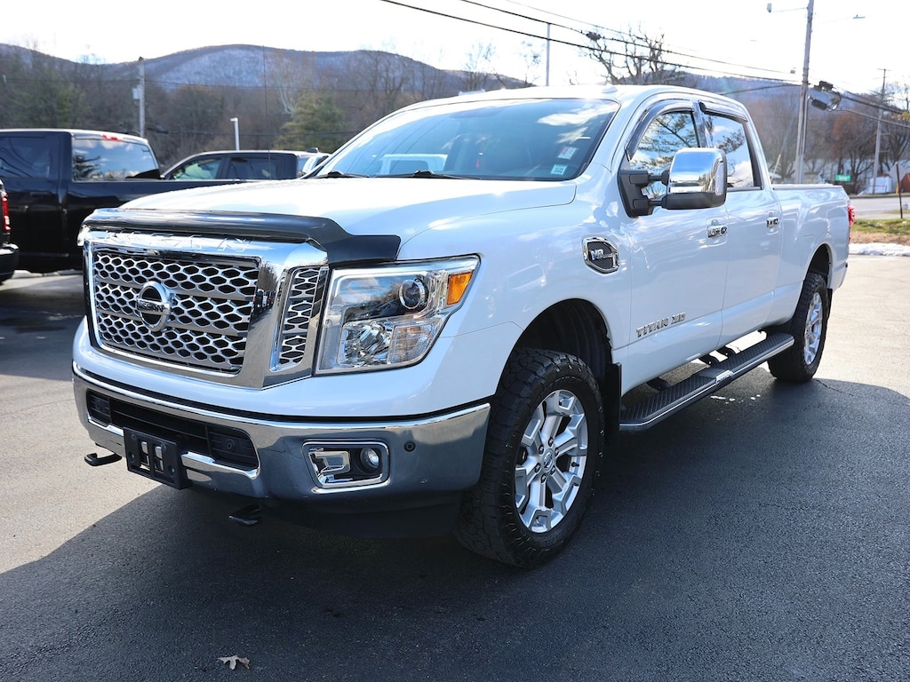 Pearl White 2017 Nissan Titan XD SL 4WD 7-Speed Automatic 5.6L V8 12 Speakers, 2.937 Axle Ratio, 4-Wheel Disc Brakes, ABS brakes, Air Conditioning, Alloy wheels, AM/FM radio: SiriusXM, Auto tilt-away steering wheel, Auto-dimming door mirrors, Auto-dimming Rear-View mirror, Automatic temperature control, Brake assist, Bumpers: chrome, CD player, Compass, Delay-off headlights, Driver door bin, Driver vanity mirror, Dual front impact airbags, Dual front side impact airbags, Electronic Stability Control, Emergency communication system, Front anti-roll bar, Front Bucket Seats, Front Center Armrest, Front dual zone A/C, Front fog lights, Front reading lights, Front wheel independent suspension, Garage door transmitter: HomeLink, Heated Captain's Chairs, Heated door mirrors, Heated front seats, Illuminated entry, Leather Seat Trim, Leather steering wheel, Low tire pressure warning, Memory seat, Navigation System, Occupant sensing airbag, Outside temperature display, Overhead airbag, Overhead console, Panic alarm, Passenger door bin, Passenger vanity mirror, Power door mirrors, Power driver seat, Power passenger seat, Power steering, Power windows, Radio data system, Radio: NissanConnect w/SiriusXM/Navi & Mobile Apps, Rain sensing wipers, Rear anti-roll bar, Rear seat center armrest, Rear step bumper, Rear window defroster, Remote keyless entry, Rockford Fosgate Premium 12 Speaker Audio System, Security system, Speed control, Speed-sensing steering, Speed-Sensitive Wipers, Split folding rear seat, Steering wheel memory, Steering wheel mounted audio controls, Tachometer, Telescoping steering wheel, Tilt steering wheel, Traction control, Turn signal indicator mirrors, Variably intermittent wipers, Voltmeter, Wheels: 20 x 7.5 Painted Alloy.