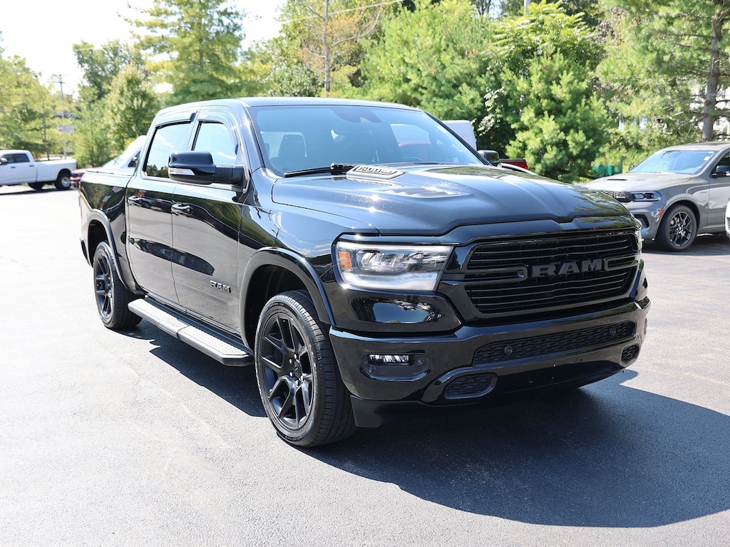 Certified. Diamond Black Crystal Pearlcoat 2022 Ram 1500 Laramie 4WD 8-Speed Automatic HEMI 5.7L V8 Multi Displacement VVT #1 Seat Foam Cushion, 10 Speakers, 2nd Row In Floor Storage Bins, 3 Rear Seat Head Restraints, 3.21 Rear Axle Ratio, 4 Way Front Headrests, 4-Wheel Disc Brakes, 48V Belt Starter Generator, 4G LTE Wi-Fi Hot Spot, 8.4 Touchscreen Display, ABS brakes, Accent Color Premium Power Mirrors, Adjustable pedals, Air Conditioning, All R1 High Radios, All Radio Equipped Vehicles, Alloy wheels, AM/FM radio: SiriusXM, Anti-Spin Differential Rear Axle, Apple CarPlay, Apple CarPlay/Android Auto, Audio memory, Auto High Beam Headlamp Control, Auto-dimming door mirrors, Auto-Dimming Exterior Driver Mirror, Auto-dimming Rear-View mirror, Automatic temperature control, Black Exterior Truck Badging, Black Headlamp Bezels, Black Interior Accents, Black Painted Exterior Mirrors Caps, Blind Spot & Cross Path Detection, Body Color Door Handles, Body Color Front Bumper, Body Color Rear Bumper w/Step Pads, Brake assist, Bucket Seats, Bumpers: chrome, Chrome Exterior Mirrors, Compass, Connected Travel & Traffic Services, Connectivity - US/Canada, Convex Wide-Angle Mirror Insert, Delay-off headlights, Delete LED Lamp - Floor Console Bin, Disassociated Touchscreen Display, Dome Dual LED Reading Lamp, Driver door bin, Driver Seat Memory, Driver vanity mirror, Dual Exhaust w/Black Tips, Dual front impact airbags, Dual front side impact airbags, Dual-Pane Panoramic Sunroof, Electronic Stability Control, Exterior Mirrors Courtesy Lamps, Exterior Mirrors w/Heating Element, Exterior Mirrors w/Memory, Exterior Mirrors w/Supplemental Signals, Foam Bottle Insert (Door Trim Panel), For Details, Visit DriveUconnect.com, For More Info, Call 800-643-2112, Front anti-roll bar, Front Center Armrest w/Storage, Front dual zone A/C, Front fog lights, Front License Plate Bracket, Front reading lights, Front Seat Back Map Pockets, Front wheel independent suspension, Full Length Upgraded Floor Console, Fully automatic headlights, Garage door transmitter, Global Telematics Box Module (TBM), Google Android Auto, GPS Antenna Input, GPS Navigation, Grille Surround 3 Black Texture 2 Black, HD Radio, Heated door mirrors, Heated Front Seats, Heated front seats, Heated Steering Wheel, Heated steering wheel, Heavy-Duty Engine Cooling, Illuminated entry, Integrated Center Stack Radio, Integrated Voice Command w/Bluetooth, Laramie Level II Equipment Group, Leather steering wheel, Leather Trim 40/20/40 Bench Seat, Leather Trimmed Bucket Seats, LED Dome/Reading Lamp, Low tire pressure warning, Memory seat, Mopar Black Tubular Side Steps, MOPAR Front & Rear Rubber Floor Mats, Night Edition, Occupant sensing airbag, Outside temperature display, Overhead airbag, Overhead console, Panic alarm, ParkSense Front/Rear Park Assist w/Stop, ParkView Rear Back-Up Camera, Passenger door bin, Passenger vanity mirror, Pedal memory, Power 2-Way Driver Lumbar Adjust, Power 2-Way Passenger Lumbar Adjust, Power 8-Way Driver & Passenger Seats, Power door mirrors, Power driver seat, Power passenger seat, Power steering, Power windows, Power-Folding Mirrors, Quick Order Package 25H Laramie, Radio data system, Radio: Uconnect 5 Nav w/8.4 Display, Radio: Uconnect 5 W w/8.4 Display, Rain Sensitive Windshield Wipers, Rear 60/40 Folding Seat, Rear anti-roll bar, Rear seat center armrest, Rear step bumper, Rear window defroster, Remote keyless entry, Remote Tailgate Release, Security system, SiriusXM Radio Service, SiriusXM w/360L, Speed control, Split folding rear seat, Sport Performance Hood, Steering wheel mounted audio controls, Tachometer, Telescoping steering wheel, Tilt steering wheel, Traction control, Trailer Brake Control, Trip computer, Turn signal indicator mirrors, Twill Film Appliques, USB Host Flip, Variably intermittent wipers, Ventilated Front Seats, Ventilated front seats, Voltmeter, Wheels: 18 x 8 Aluminum Base Painted, Wheels: 22 x 9 Forged Aluminum, Wireless Charging P