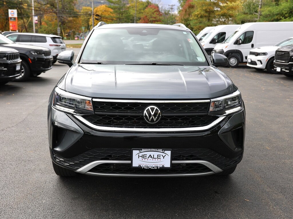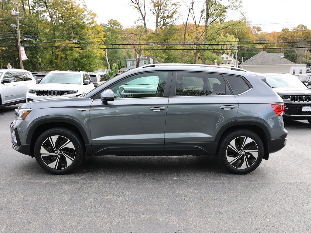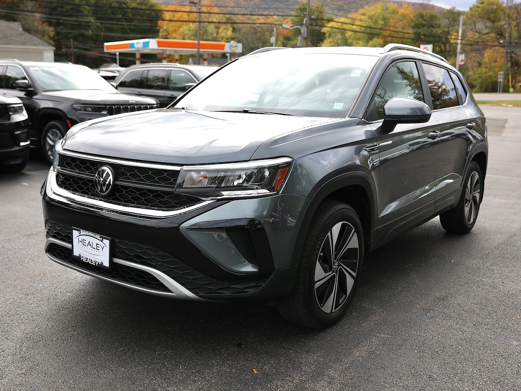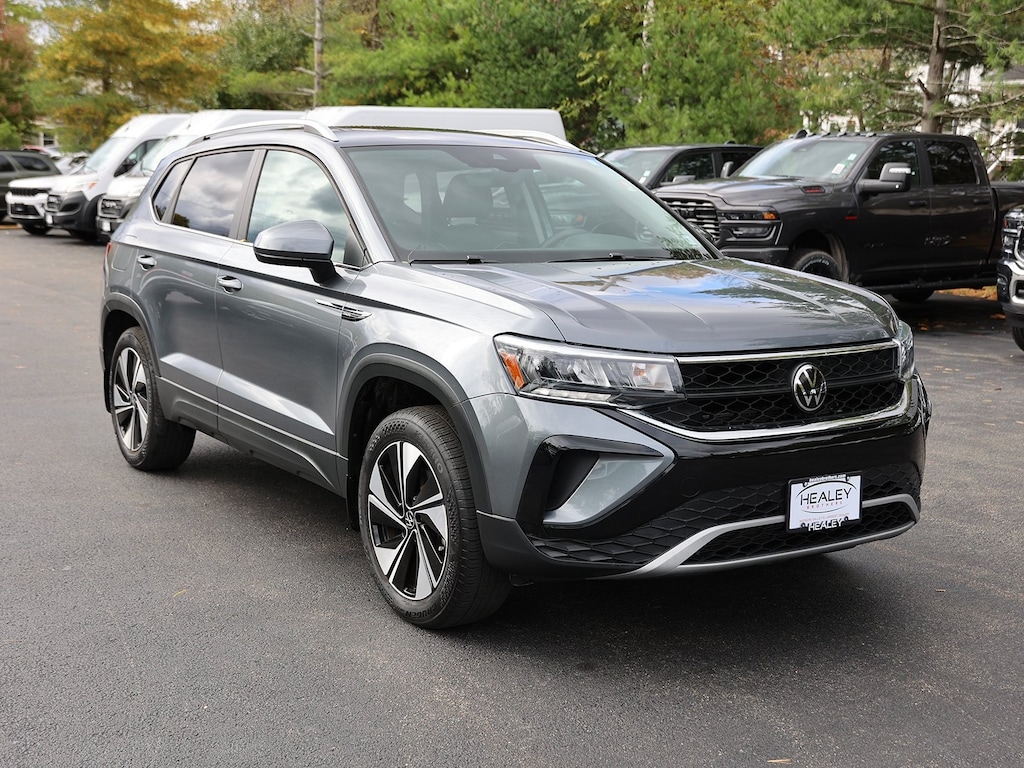 Gray 2024 Volkswagen Taos 1.5T SE AWD 7-Speed DSG Automatic with Tiptronic 1.5L I4 Turbocharged DOHC 16V LEV3-SULEV30 158hp 4-Wheel Disc Brakes, 5.20 Axle Ratio, 6 Speakers, ABS brakes, Active Blind Spot Monitor, Air Conditioning, Alloy wheels, AM/FM radio: SiriusXM with 360L, Auto High-beam Headlights, Automatic temperature control, Brake assist, Bumpers: body-color, CloudTex & Cloth Seating Surfaces, Compass, Delay-off headlights, Driver door bin, Driver vanity mirror, Dual front impact airbags, Dual front side impact airbags, Electronic Stability Control, Emergency communication system: VW Car-Net Safe & Secure 5-year, Exterior Parking Camera Rear, Four wheel independent suspension, Front anti-roll bar, Front Bucket Seats, Front Center Armrest, Front dual zone A/C, Front reading lights, Front Strut Rear Multi-Link Suspension, Fully automatic headlights, Heated door mirrors, Heated Front Bucket Seats, Heated front seats, Heated steering wheel, Illuminated entry, Leather Shift Knob, Low tire pressure warning, Occupant sensing airbag, Outside temperature display, Overhead airbag, Overhead console, Panic alarm, Passenger door bin, Passenger vanity mirror, Power door mirrors, Power driver seat, Power steering, Power windows, Radio data system, Radio: MIB3 Composition Media AM/FM/HD, Rain sensing wipers, Rear anti-roll bar, Rear seat center armrest, Rear window defroster, Rear window wiper, Remote keyless entry, Security system, Speed control, Speed-sensing steering, Split folding rear seat, Spoiler, Steering wheel mounted audio controls, Tachometer, Telescoping steering wheel, Tilt steering wheel, Traction control, Trip computer, Variably intermittent wipers, Wheels: 18 2-Tone Machined Alloy.